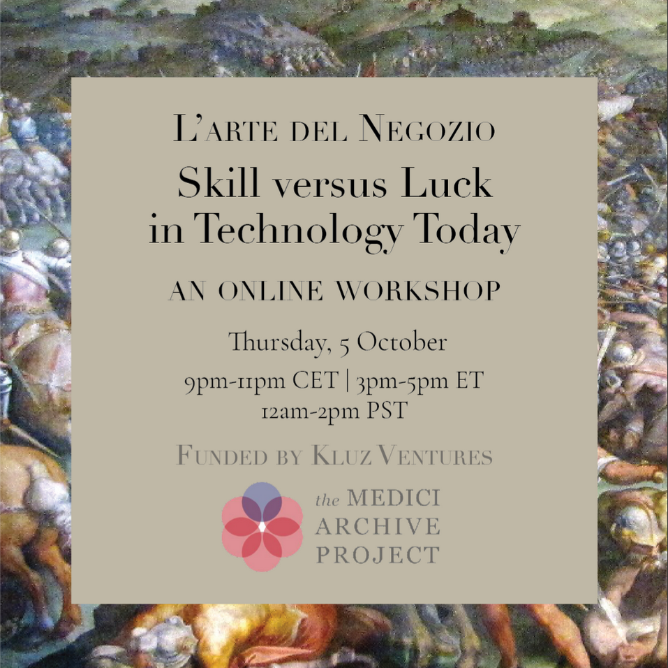 The Medici Archive Project’s L’Arte di Negozio program sponsored by Kluz Ventures is pleased to present an online workshop, “Skill versus Luck in Technology Today”.